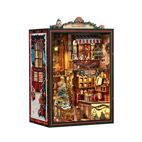 A festive Christmas-themed book nook with 264 pieces, warm touch-sensitive LED lighting, and a built-in music mechanism. Brings cozy holiday charm to any bookshelf. DIY Christmas Shop Size miniature book nook kit with detailed interior display; Christmas themed, fireplace with stockings included, includes miniature snowman and decorations; Christmas-themed book nook miniature kit, includes music box, touch sensor lighting, features 'Jingle Bells' song, dust cover included DIY Christmas Shop Size theme; Christmas themed miniature house kit with fireplace, stockings, and holiday decorations; Christmas-themed book nook, currently playing 'Jingle Bells', includes music and touch switch controls