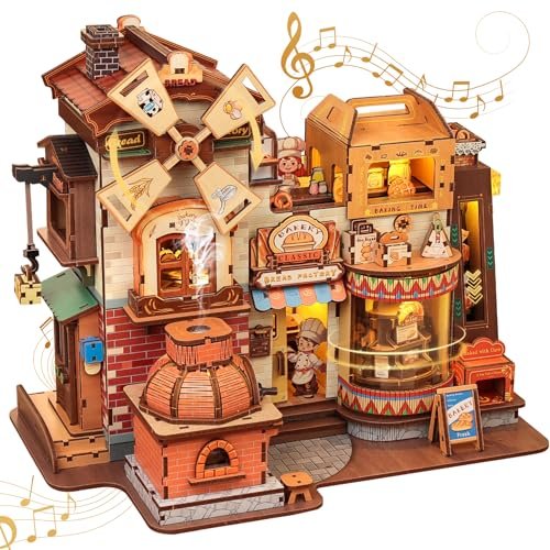 Wooden puzzle pieces, LED lighting system, music box mechanism, atomization mist module, Type-C power interface, 360° rotating display base, rotatable windmill components