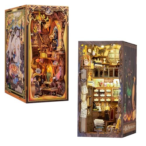 A magical fantasy book nook inspired by a famous wizard novel, featuring 10 rare creatures, enchanted scenes, and LED lighting for a glowing shelf display. Book nook/dollhouse kit with two-story design, includes assembly instruction diagram visible on right side; Dust cover included, Easy to assemble; CuteBee brand, Decor Bookshelf Insert, miniature book nook kit with vintage/steampunk theme; Magic Pharmacist themed bookshelf decoration, includes decorative book spines on sides, interior pharmacy/apothecary scene with detailed miniatures; Rotating mechanism dial; theme appears to be magic/supernatural related with zodiac or celestial circle design; Cabinet Beast, Lantern Grandpa (Character Amiibo), Magic Chessboard - interactive elements described; Secret Room themed miniature book nook/dollhouse kit with wooden construction, includes furniture and decorative accessories Well Constructed; appears to be a two-story miniature book nook/dollhouse with detailed interior scenes; instruction manual visible in lower right; product shown with assembled example and construction diagrams; Easy to Assemble; CuteBee Decor Bookshelf Insert - book nook/dollhouse kit; Magic Pharmacist themed bookshelf decoration, includes decorative books on sides; Rotating mechanism - Simply Rotate The Dial. This appears to be a Fullmetal Alchemist themed product based on the transmutation circle and character imagery visible.; Cabinet Beast, Lantern Grandpa (Character Amiable), Magic Chessboard - detailed display features shown; Secret Room themed miniature book nook/dollhouse kit with multiple room scenes displayed