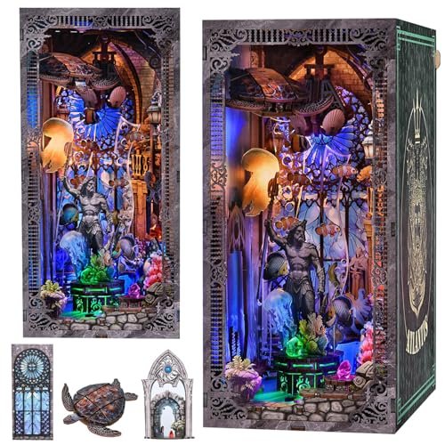 Dive into the lost city of Atlantis with this book nook featuring Poseidon's statue, coral reefs, and a glowing underwater waterfall with multi-color LED lighting. Miniature book nook/dollhouse kit with detailed underwater/fantasy theme, includes decorative elements like flowers, rocks, and aquatic features; Book nook/dollhouse kit with detailed interior scenes, elaborate decorative elements, multiple viewing angles shown, appears to be a fantasy/mystical themed design; Product name: Atlantis, Assembly Difficulty: 2 out of 5 stars Underwater/aquatic theme with glowing flora and fauna details; Book nook dollhouse kit with detailed interior scenes, ornate frame design, colorful illuminated display with multiple diorama sections; ATLANTIS theme, DIY Book Nook Kit