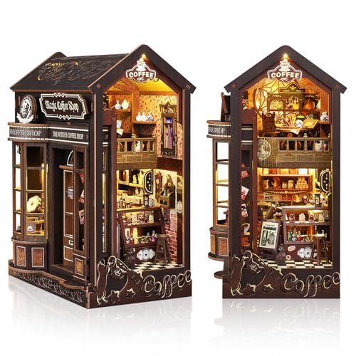 Coffee shop themed book nook; includes candle in lifestyle photo; Coffee Break themed miniature book nook / dollhouse kit; Coffee-themed miniature book nook dollhouse kit with warm interior lighting; Coffee-themed book nook miniature with interior shelving and decorative details; Magic Coffee Shop themed miniature book nook kit with interior lighting visible; Coffee shop themed miniature book nook kit, two-sided design showing front and interior views