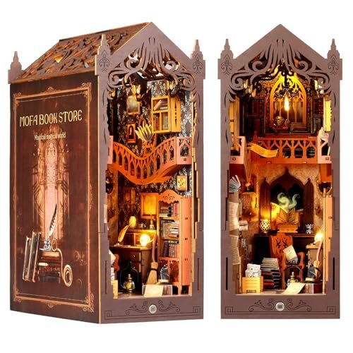 A fantasy-themed miniature book nook with LED lighting, crafted from wood, paper, metal, and plastic. Transform your bookshelf into a magical miniature world.