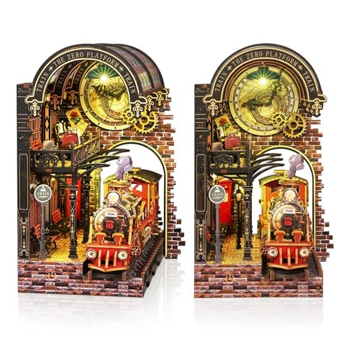 Creativity and difficulty indicators shown; steampunk/train themed book nook; Steampunk train theme, includes decorative stained glass dome roof; Simple assembly, red plastic components visible, assembly instructions shown; Steampunk/industrial themed book nook with train motif; features illuminated elements (yellow clock face, red train car with lights); displayed on wooden desk with vintage leather-bound book; Train/locomotive themed book nook with decorative wooden structure and colorful fabric canopy top; Steampunk-themed book nook kit with two view angles shown; features a clockwork design with train and mechanical elements; includes decorative elements and detailed miniature architecture
