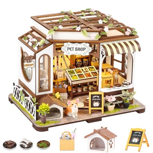 A charming pet shop diorama with white and brown walls, striped awning, PET SHOP signage, dog model, shelves, and LED lighting. Great bookshelf insert or standalone display. Pet shop themed miniature book nook/dollhouse kit; includes detailed accessories and furnishings; wooden construction; Pet Shop DIY Miniature House kit; Miniature book nook / dollhouse kit with warm LED lighting; Easy assembly, pet shop themed miniature kit, includes instruction manual with diagrams; Pet Shop themed miniature dollhouse kit; includes accessories such as pet bowls, food items, basket, pet house, and sandwich board sign; features decorative roof with flowers and plants; brown and white color scheme with striped awning Pet Shop themed miniature book nook kit; includes detailed furnishings and decorative items; Pet Shop themed DIY Miniature House kit; Tagline: 'Light Up Your Life'; Easy assemble, transform parts into beautiful pet shop, instruction manual visible in image; Pet shop themed miniature book nook kit; includes accessories (pet bowls, plants, signage, pet house); appears to be a complete dollhouse/diorama set