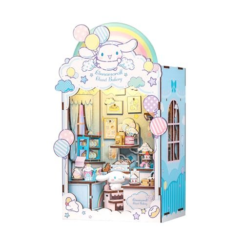 Build a dreamy sky-high bakery starring Cinnamoroll in this kawaii book nook kit with touch-activated LED lights and 158 laser-cut wooden pieces. Cinnamoroll Cloud Bakery themed miniature book nook/dollhouse kit; includes decorative elements and accessories; dust cover not visible but appears to be a display/lifestyle product image; Cinnamoroll Cloud Bakery themed miniature book nook/dollhouse kit; Cinnamoroll & Cloud Bakery themed miniature book nook/dollhouse kit; Cloud Bakery themed; DIY Book Nook Kit; includes LED lighting; CE marked; instruction manual visible on packaging; Cinnamoroll Cloud Bakery themed miniature book nook/dollhouse kit; includes decorative elements like balloons, rainbow, clouds, and bakery accessories; dust cover included Cinnamoroll Cloud Bakery themed miniature book nook kit; Cinnamoroll Cloud Bakery theme; Cinnamoroll & Cloud Bakery themed miniature book nook/dollhouse kit; Cloud Bakery DIY Book Nook Kit, includes LED lights, Cunnamoroll brand; Cinnamon's Cloud Bakery themed miniature book nook/dollhouse kit
