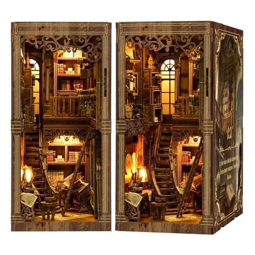 A cozy cat café book nook insert featuring four LED light sources, lush greenery, a coffee machine, dessert cabinet, and movable window pendants for a charming afternoon tea scene. Book nook/dollhouse kit; includes gear drive mechanism; requires removal of flimbefore assembly; touch/lighten activation visible in instructions; Antique Book Collection Room theme, 5-star assembly difficulty rating; Book nook/dollhouse kit with detailed interior scenes, warm ambient lighting in completed builds, multiple room configurations with miniature furnishings and decorative items Remove flimbefore assembly, Gear drive mechanism, Lighten feature visible; Antique Book Collection Room theme