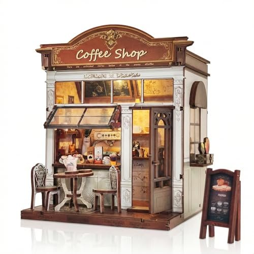 A retro café-inspired book nook shelf insert with 143 pieces and warm touch-control LED lighting. Brings cozy coffee shop charm to any bookshelf.