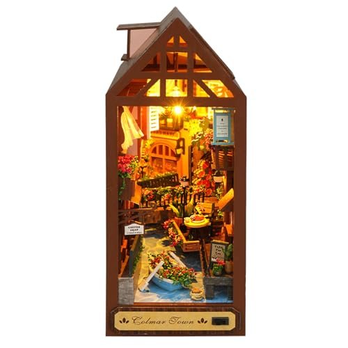 A cozy wooden book nook miniature kit with intricate details. Snap-together laser-cut wood construction, no glue required. Finished size approx. 15.9×9.2×22.5cm.