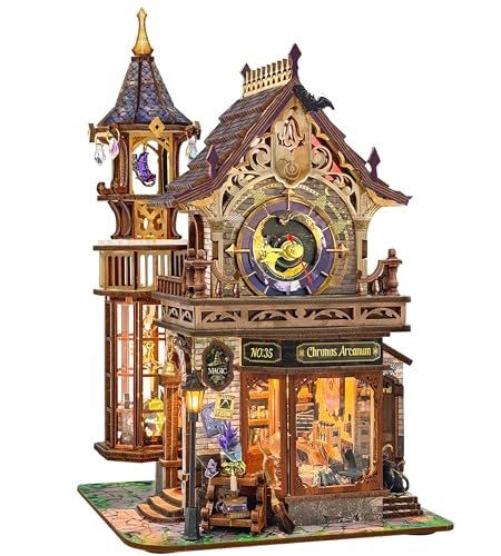 A magical miniature clock shop bursting with intricate details and glowing lights. Assemble this enchanting bookshelf insert in 2–3 hours. Accessories package includes hardboard and electronic components; Open to change the battery, Potion Aromm theme, touch sensor lights included; Four miniature book nook scenes shown: Time-Crystal Ball, Magic Shell, Post Owl, and Magic Black Cat themes; Chirouus Aconium themed miniature book nook kit with detailed facade, stone base, street lamp, furniture, and roof elements visible in assembled state; Time Magic Club themed miniature book nook/dollhouse kit with decorative box packaging; Miniature book nook/dollhouse kit with clock tower, storefront detail, and illuminated interior Accessories package includes hardboard and electronic components; Open to change the batteries, Potion Aroma theme; Four themed miniature book nook scenes shown: 'Time Crystal Ball', 'Magic Shell', 'Rose Owl', 'Magic Black Cat'; Chirurms Apothecary themed book nook kit with storefront design, includes decorative elements and base; Time Magic Club themed miniature book nook/dollhouse kit