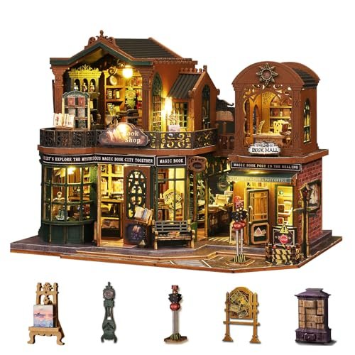 A fantasy-themed miniature house diorama with magical elements and cool LED lighting, designed as a shelf insert or bookend display. Suitable for beginners aged 14+.