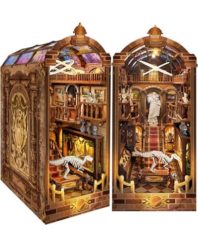 Step inside a grand museum complete with ancient sculptures, dinosaur skeletons, and plant specimens. Features warm LED lighting and a dust cover for display. Brand: Quanquer; Materials: Wood, Paper, Sticker; Functionality: DIY/Intellect/Collections/Gift; soft lighting illuminates scenes, book nook/dollhouse kit theme appears to be museum/library with dinosaur skeleton and architectural dome Brand: Quanquer; Materials: Wood, Paper, Sticker; Functionality: DIY/Intellect/Collections/Gift; soft lighting illuminates scenes