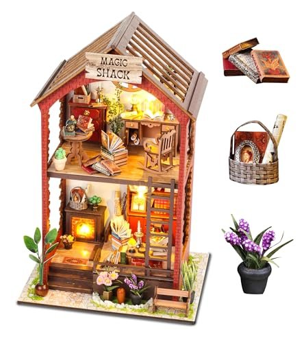 A miniature library-themed book nook shelf insert with touch LED lighting. Craft-style build requiring glue and patience, ideal for bookshelf display.
